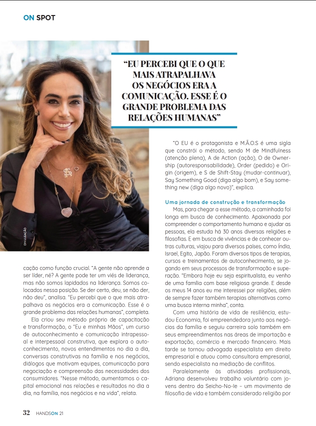 O “Eu e Minhas M.ã.o.s” é um método autoral criado por Adriana Secali que integra comunicação construtiva, práticas de autoconhecimento e ferramentas de mediação de conflitos. Cada letra da palavra M.Ã.O.S. é uma passo a passo do método.
